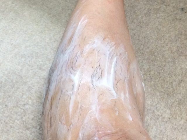 「MONOVOヘアリムーバークリーム」を足の指、甲、脛、太腿のムダ毛に塗る